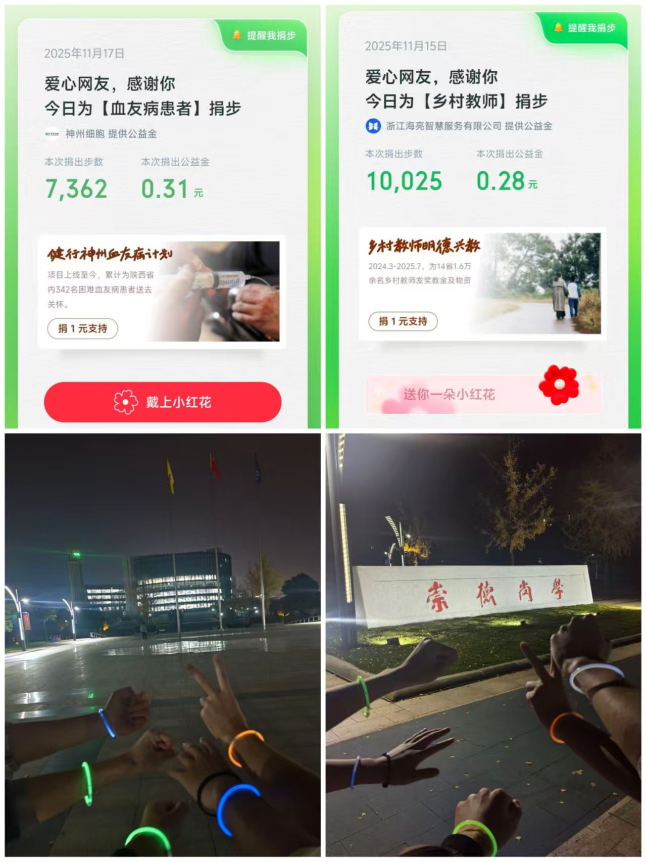 夜间校园内,跃动的荧光成为一道亮丽风景。学院2025级本科生谢浩然表示:“活动不仅锻炼了身体,更让我体会到为环保和公益贡献力量的共鸣与快乐。”