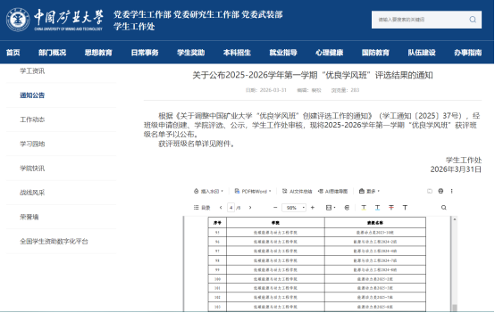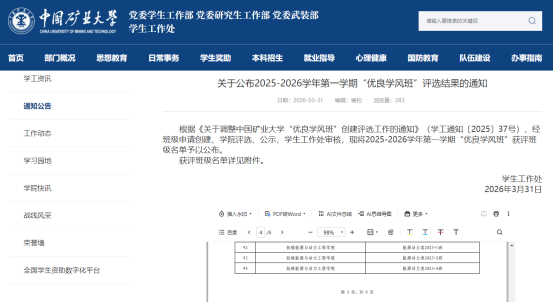 3月31日,校学生工作处发布“2025-2026学年第一学期‘优良学风班’获评班级名单”,我院能源动力类2023-1班等共计12个班级获评校级“优良学风班”的荣誉称号。