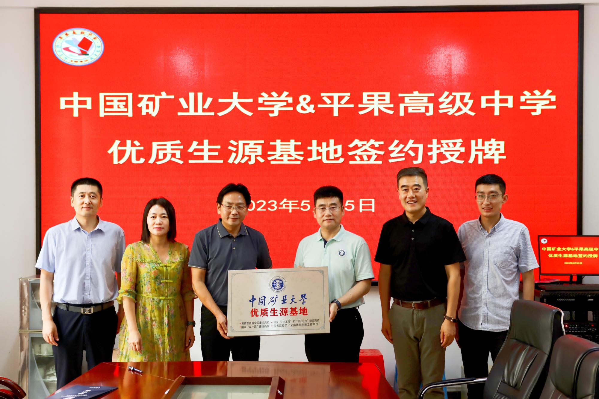 座谈会后,于基伯副书记代表学校与两所中学签订了“优质生源基地”协议,张磊书记为两所中学授予“中国矿业大学优质生源基地”牌匾并合影留念。