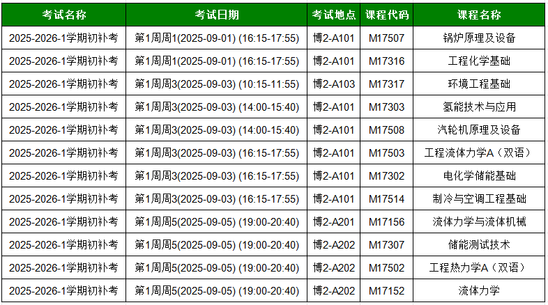 低碳能源与动力工程学院2025-2026-1学期初补考安排见下表,已经在系统里进行过考试确认的同学,通过学生个人教务系统查询自己的考试时间及地点等信息。2025年7月前办理过缓考学生如需参加考试,请携带相关申请材料(缓考申请单-学生学院教学办核实签字-盖学生学院公章)于考试前1天到计算机楼A223办理考试申请手续。